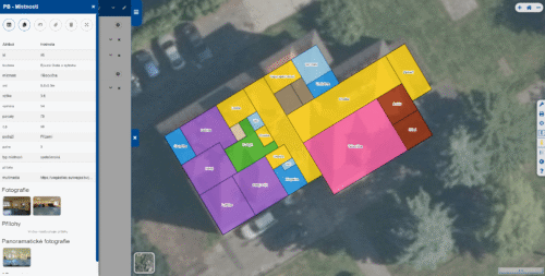 Nad rámec předchozího rozkreslíme geometrii na jednotlivé místnosti (zjednodušené bez zdí). Místnosti rozměříme laserovými dálkoměry a pořídíme 360°panoramatické fotografie. Plocha místnosti bude skutečná dle rozměření (bez vlivu zdí). Místnosti budou mít svoje ID a můžeme k nim připojit od MěÚ údaje např. o nájemci, platbě za místnost / jednotku.