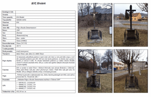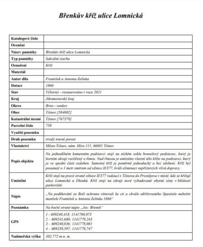 - Podrobné informace o památce (název, vlastník, typ, datace, materiál, popis objektu, umístění, parcelní číslo, stav, ochrana, autor díla, navrhované opatření,…)